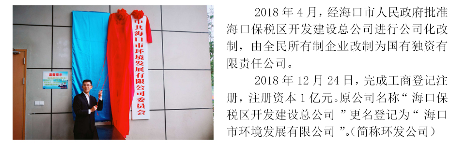 海口市環(huán)境發(fā)展有限公司是海口市屬國有獨資有限責任公司,于2018年12月正式掛牌運營,注冊資本1億元,由1993年12月成立的海口保稅區(qū)開發(fā)建設總公司進行公司化改制而成,核心業(yè)務為環(huán)境環(huán)衛(wèi)產(chǎn)業(yè)投資和運營、資產(chǎn)運營和管理,培育業(yè)務為工程管理